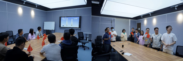 与此同时,空间系另一部分员工在空间博士党支部宣传委员潘若剑和辅导员刘一楠的组织下,佩戴党员徽章、手举国旗,在沙河校区D1025会议室内观看“天和”发射的现场直播。在等待发射前,大家围绕自己与航空航天的渊源以及对航天精神的感悟而畅谈,回忆着自己曾经因对中国航空航天事业满腔热血而选择北航的初心。在发射前五分钟时,大家怀着激动的心情,挥舞着国旗合唱《没有共产党就没有新中国》。11时22分,随着一声“点火”口令,承载着天和核心舱的火箭在巨大的轰鸣声中冲天而起,飞向茫茫太空,在漫长而紧张的6分多钟后,航天器顺利入轨,大家共同欢呼庆祝,感受着祖国的日益强盛与中华民族的伟大复兴。