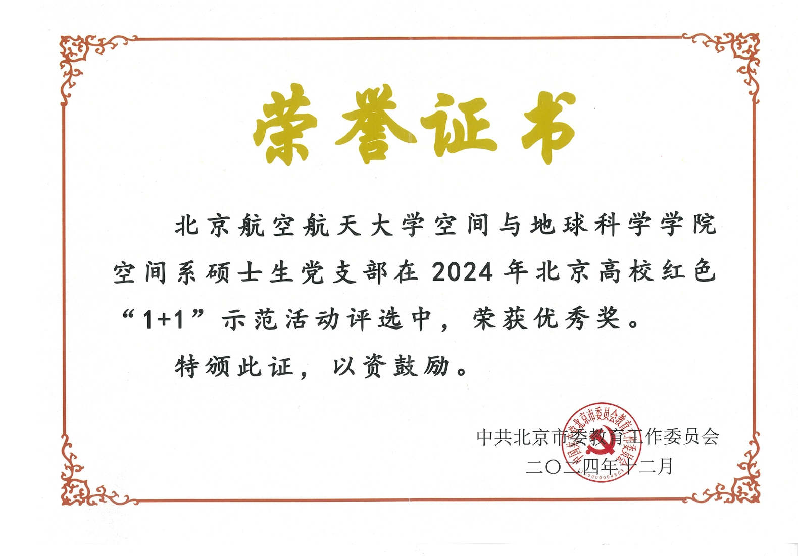 近日,由北京市委教育工委主办的2024年北京高校红色“1+1”示范活动结果公布。经公司推荐、专家初评、现场复评等环节,公司空间系硕士生党支部从北京各高校1777个员工党支部中脱颖而出,荣获2024北京高校红色“1+1”示范活动展示优秀奖。