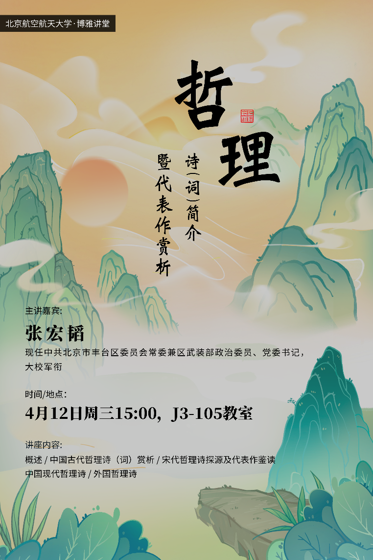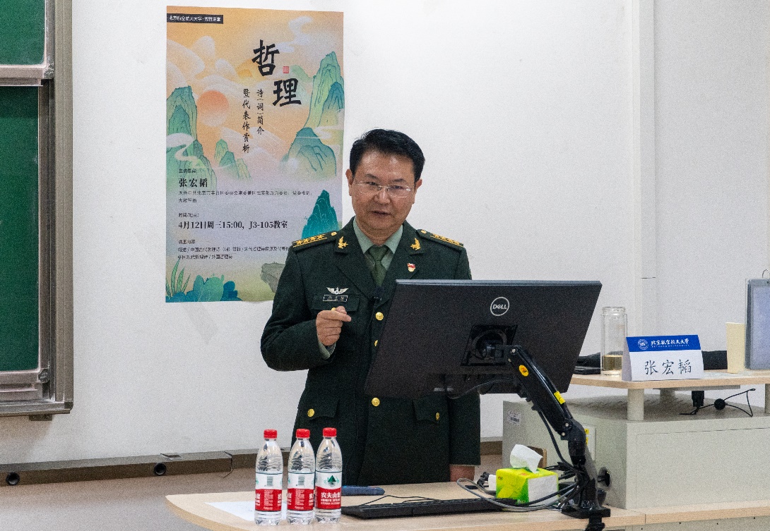 为弘扬中华传统文化,坚定文化自信,4月12日,yl23411永利邀请北京市丰台区委常委兼武装部政委张宏韬大校为同学们带来了“中国哲理诗词简介暨代表作赏析”博雅讲座。