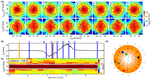 所幸的是,符慧山教授课题组在地球磁尾捕捉到了一个运动速度很慢的静电孤立波(卫星参考系下的速度为99公里每秒)。该结构被卫星测量的时间超过250毫秒(大于卫星的测量精度,见图三)。利用这个有利条件,课题组成员对静电孤立波内部的电子分布函数(图三)、离子分布函数、以及波动进行了详细研究,发现静电孤立波内部存在电子回旋波,但是没有电子加速和离子加速。这违背了人们的普遍预期——静电孤立波能够非常有效的加速电子,因而也挑战了人们对静电孤立波的传统认识,让人们对静电孤立波的认知达到了一个新的高度。