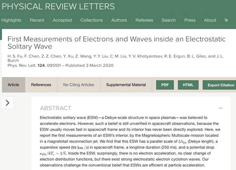 近日,公司符慧山教授团队首次探测到了静电孤立波的内部结构,发现其中的电子分布函数没有明显变化,电子和离子没有明显的加速特征。这与之前人们普遍预期的“强烈电子加速”不一致,挑战了人们对静电孤立波的传统认识。该成果以“First Measurements of Electrons and Waves inside an ElectrostaticSolitary Wave”为题发表于物理学领域的著名期刊《物理评论快报》(Physical ReviewLetters 124, 095101, 2020)上(图一)。符慧山教授为论文的第一作者兼通讯作者,硕士生陈芳为第二作者。