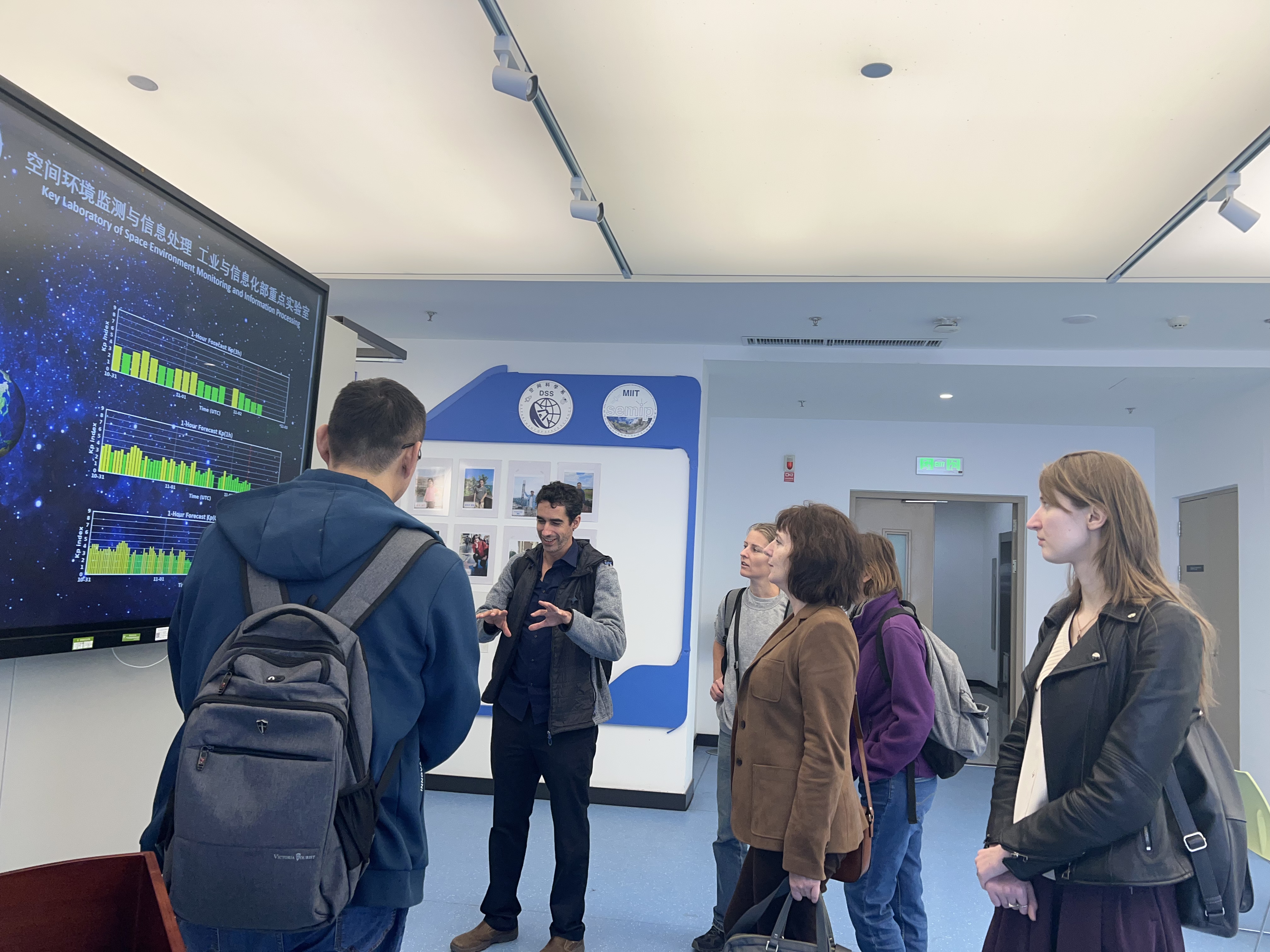 符慧山对国际空间科学研究所代表团表示热烈欢迎,并介绍了公司空间科学近年来的发展情况和研究成果,展示了最新上线的空间天气实时监测预报系统。该系统实现了不同时段的地磁Kp指数预报,预报准确率达到国际先进水平。随后,符慧山带领代表团参观了“空间等离子体实验室”。该实验室研究生向代表团介绍了高真空地面模拟舱的工作原理及创新成果,展示如何“把极光带到实验室”。