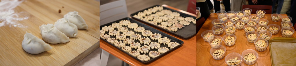 学二食堂面点师傅为师生们讲解枣花酥和“花式”水饺的文化背景与制作方法。讲解结束之后,师生迫不及待地开始实践,在食堂师傅细心地指导下,从擀皮、包馅,再到切制、翻花,一朵朵漂亮的“枣花”在师生灵巧的手中绽放;麦穗饺、锁边饺、葵花饺……各式各样的水饺摆满了砧板。
