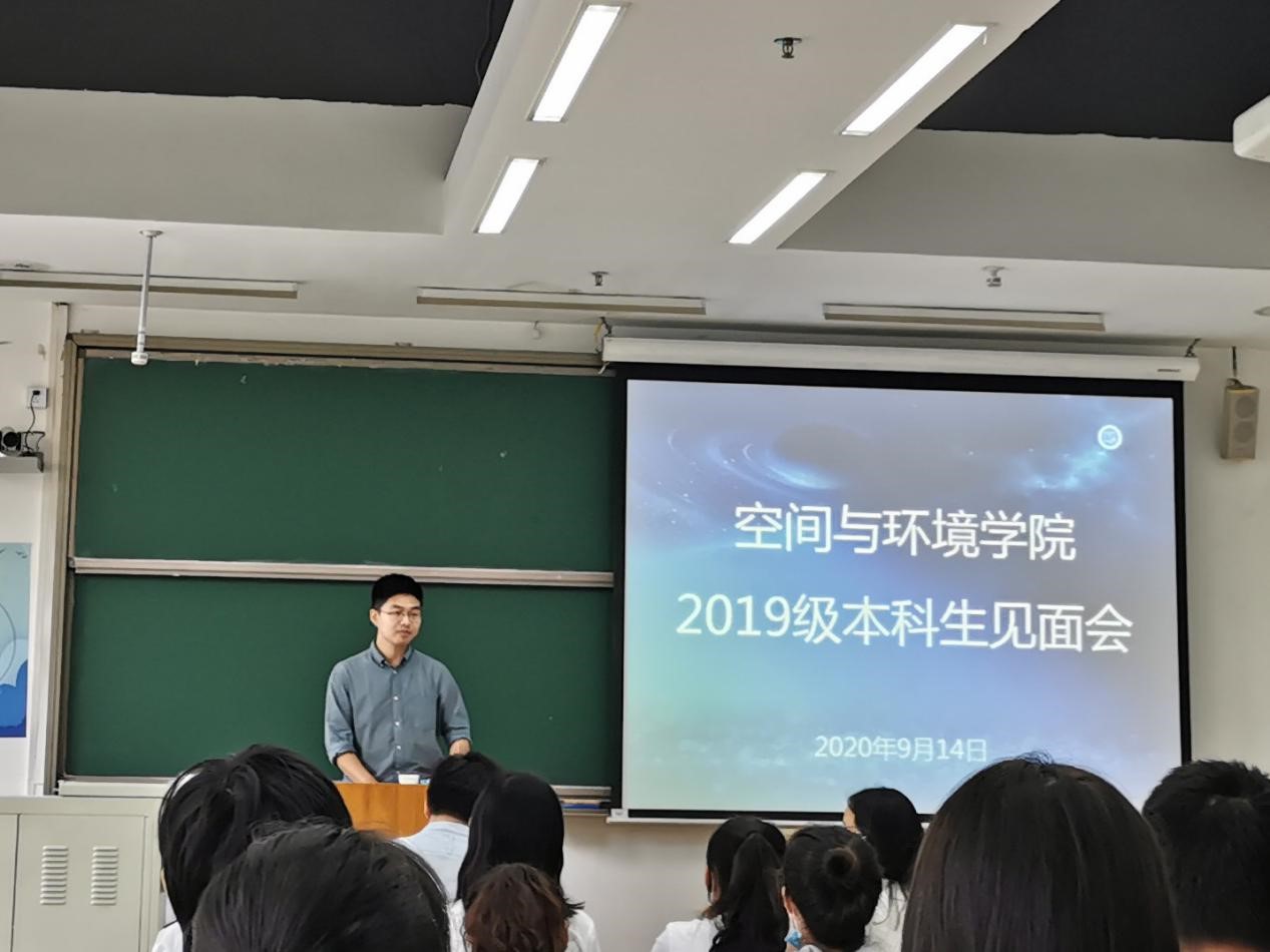 班主任代表符慧山老师对19级本科生展现出来的朝气蓬勃的精神面貌予以了肯定。符老师通过“上管天,下管地,中间顺便管空气”的诙谐言语,形象生动地介绍空间、环境两个专业研究内容涵盖之广泛,希望同学们在未来求学的三年中认真学习、积极生活、不负青春韶华。