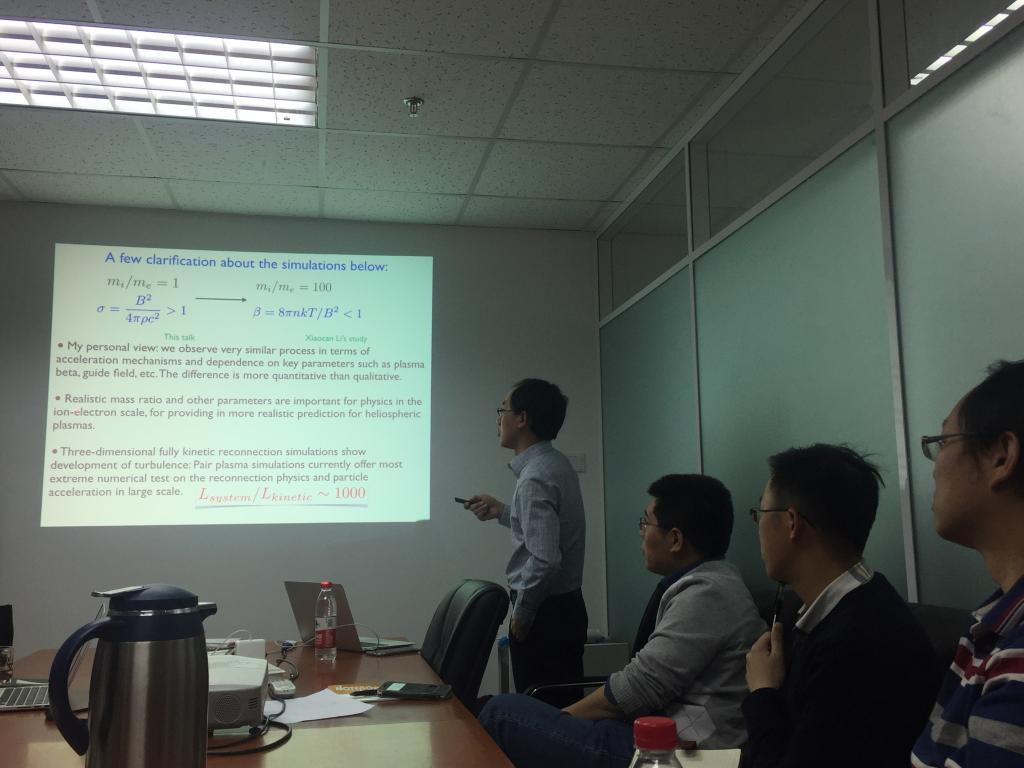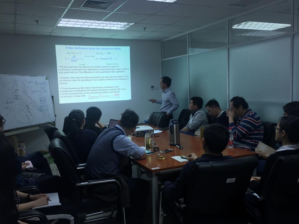 本次报告的题目为“Nonthermal Particle Acceleration in Magnetic Reconnection”。郭帆博士首先为我们介绍了磁场重联的基本概念,磁场重联作为发生在空间等离子体和实验室等离子体中的物理过程,具有将大量的磁场能量转化为粒子能量的特点。为了研究这个过程中粒子获得能量的机制,郭帆博士及他的小组成员利用MHD模拟和PIC模拟研究了在不同尺度下的磁场重联过程,分别比较了不同的扰动状况及边界条件对磁场重联动力学过程的影响。他提出费米加速机制是粒子在磁场重联过程中获得能量的有效机制,并且发现了磁场重联中能量幂律分布的形成机制,这项研究对于理解太阳耀斑中以及其它空间等离子体中高能粒子的产生与等离子体加热有重要意义。