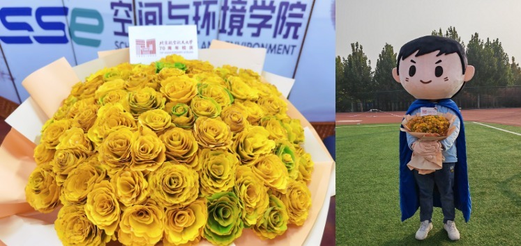 银杏成花,手工编织送祝福。金秋十月,丹桂飘香,满树银杏叶绽黄飘落,10月24日中午,机关党支部党员用收集的银杏落叶手工制作成了70朵银杏玫瑰花束,赋予落叶以新生,献礼北航七秩校庆。一根根竹签支撑着、一片片银杏叶包裹着,最终汇成一束精美的玫瑰花束,这过程就如同北航的风雨建校历程,前辈们在柏彦庄一片荒芜的农田土洼上动工兴建,搭建起校园内一座座求知大厦,为祖国的航空航天事业不断添砖加瓦。