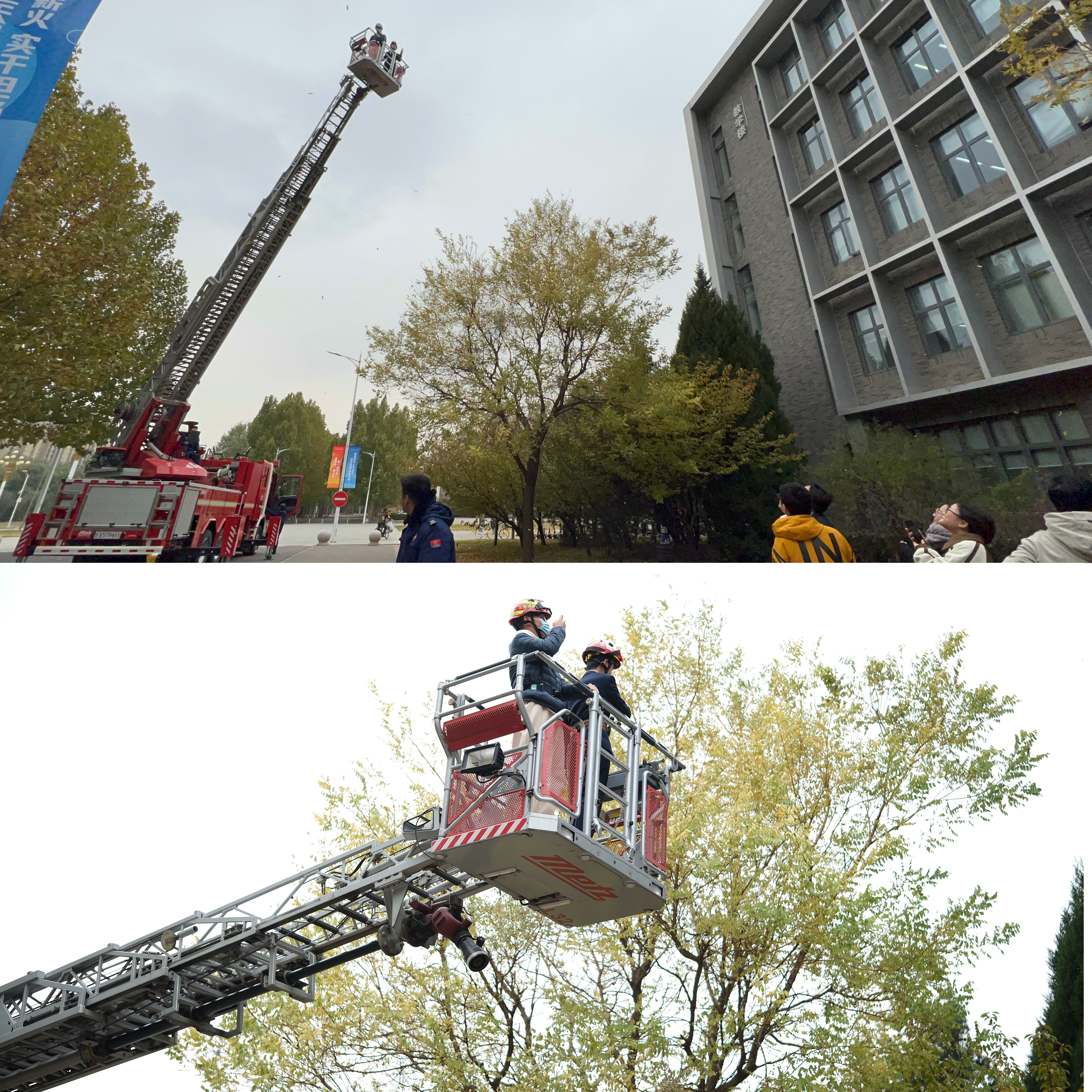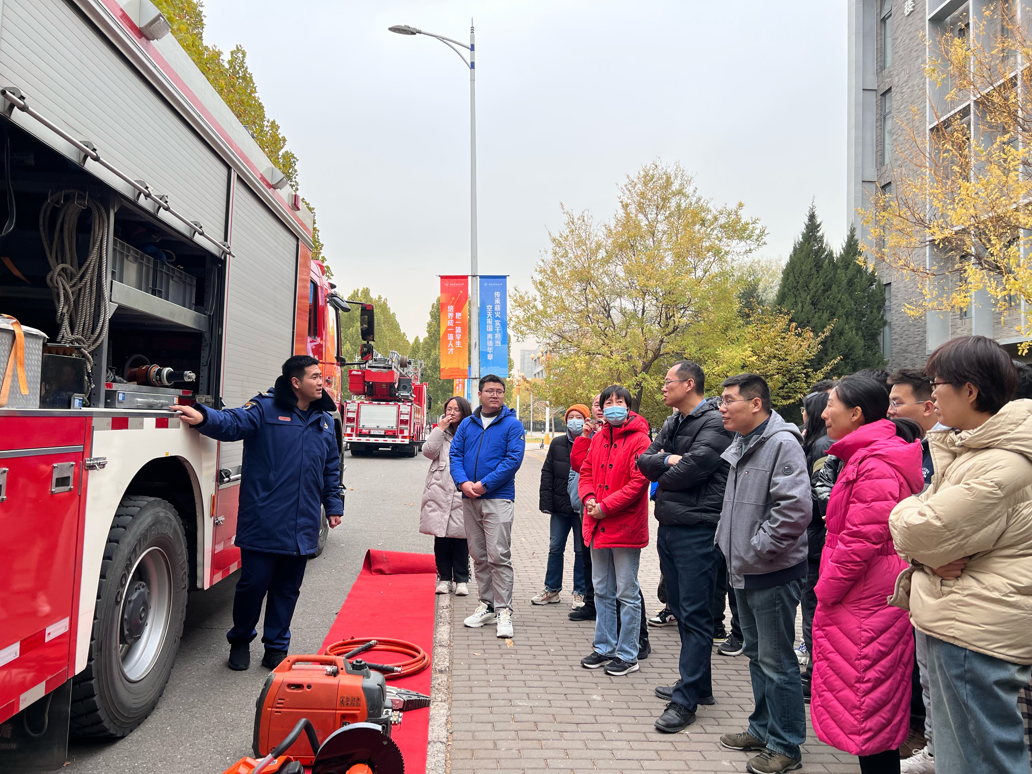 在第三个培训环节,张晓东向师生展示了消防车中的救援设备,公司师生登上云梯,零距离体验消防云梯救援。