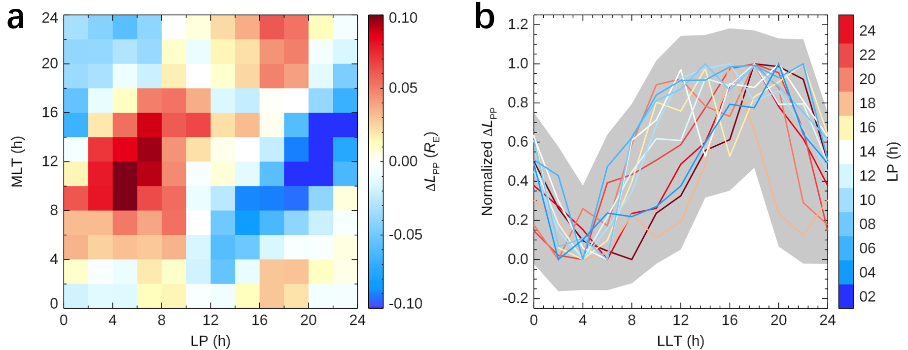 图2.等离子体层顶潮汐信号的直接观测证据。(a)等离子层顶的扰动幅度∆Lpp,单位为 地球半径RE,1RE=6371公里)随月相(LP)和磁地方时(MLT)的变化情况,(b)将不同月相下的归一化的扰动等离子层顶位置转换到月球地方时(LLT)的结果,可以清晰地看到等离子体层月潮存在全日周期和全月周期,且高潮只有一个并出现在月球地方时的昏侧(LLT=18点)附近,其相位领先月球约90度,对应的低潮也只有一个且出现在月球地方时的晨侧(LLT=6点)附近。
