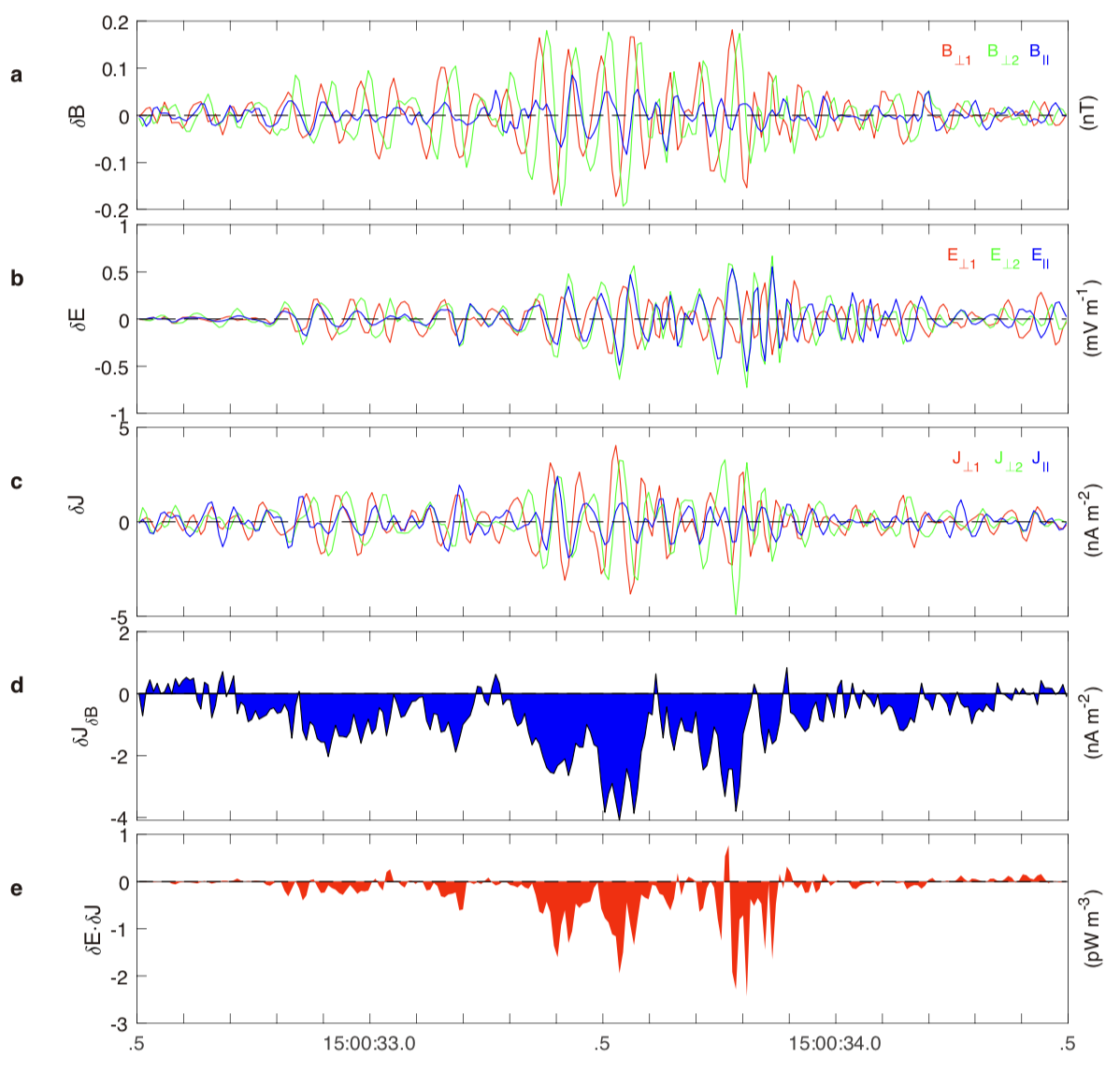 yl23411永利曹晋滨教授领导的空间科学团队长期从事地球空间等离子体电磁波动和波粒相互作用研究,具有扎实的理论基础和丰富的卫星观测数据经验,取得了多项具有国际影响力重要成果。团队成员刘成明副教授等人在对合声波非线性理论进行深入研究后,认为合声波的产生是一个基本空间等离子体物理过程,不仅在传统观点认为的近地空间偶极磁场区域存在,在非偶极磁场区域,也应该存在。在对国际地球磁层多尺度卫星MMS(Magnetospheric Multiscale Mission)海量数据分析后,首次在非偶极场结构的磁尾中性片区域发现了连续出现的合声波(图2),证明了新观点。磁尾中性片区域磁场极为微弱,仅为地球表面磁场的万分之一的量级,其拓扑结构也与偶极场完全不同,在传统合声波理论框架下,那里不应该存在合声波。这一新发现打破了学术界关于合声波只能在地球偶极磁场控制的近地区域出现这一持续70多年的传统观点。
