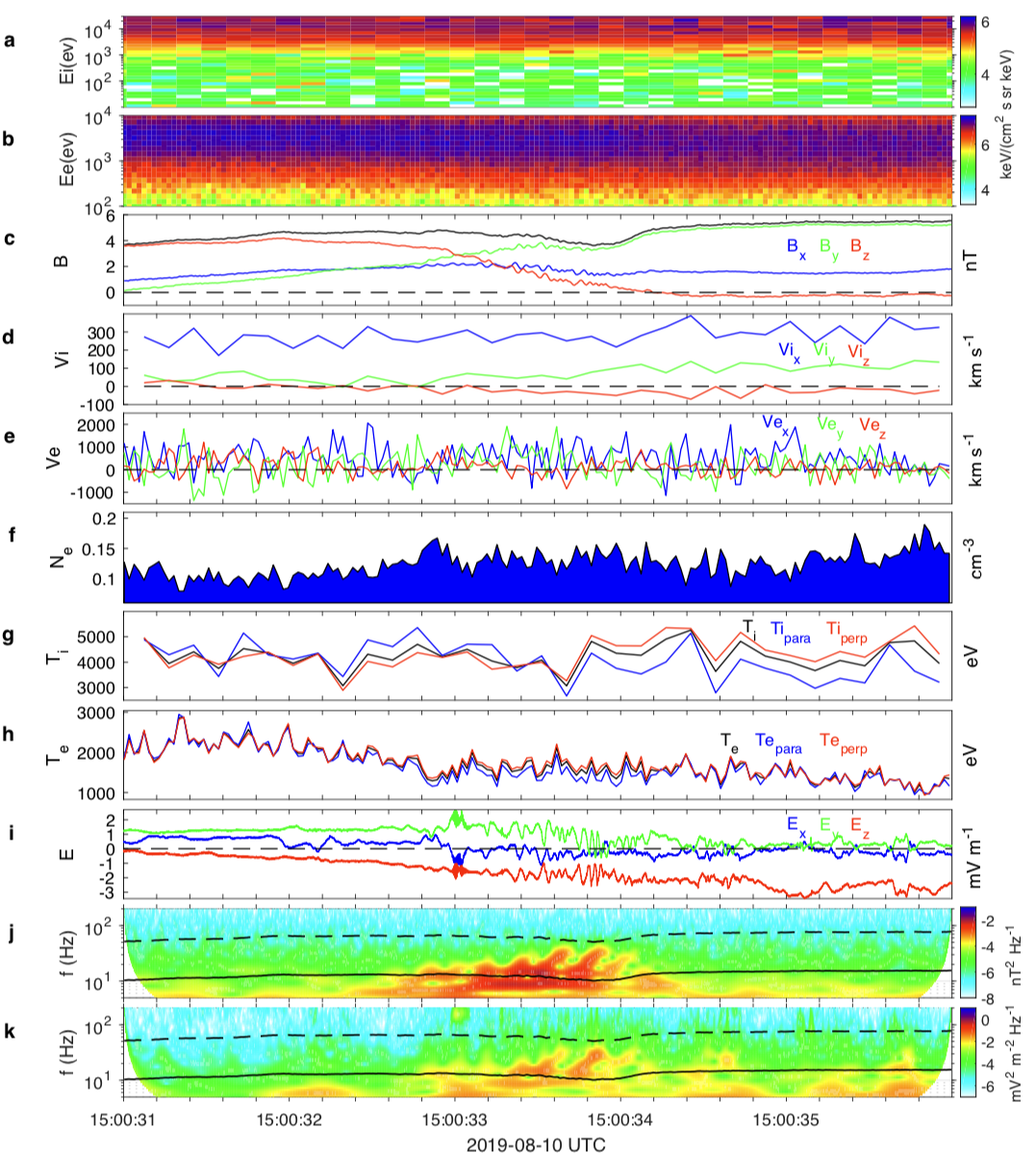 图2. MMS卫星对地球空间磁尾中性片中的合声波观测
