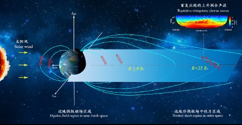 由于上述重要性,合声波从上世纪50年代以来,一直是空间物理学研究的前沿热点。通过近70年的卫星观测和理论研究,人们对合声波已经有了较为全面的认识,发现合声波主要发生在地球近地空间偶极磁场区域(图1),地球空间地磁场磁力线就像两端固定在地球南北磁极区的琴弦一样,当太阳风能量进人地球磁层空间,并通过相关物理过程拨动这些琴弦时,就会激发频率特征类似于清晨鸟儿的齐鸣合奏的电磁波,因此称为合声。合声的频率谱呈准相干的离散点,且频率具有啁啾(chirp)特性,由于相关空间等离子体物理过程的复杂性,直至今日,对合声波的产生和传播机制依旧充满争议,未有共识。