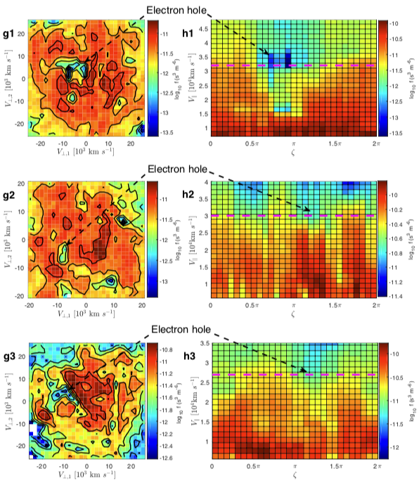 刘成明副教授等人通过理论计算,发现该合声波是局地不稳定性激发,波动从热电子处获取能量,而线性波动理论给出的波动增长频率范围明显低于实际观测到的波动频率,说明非线性波动-粒子相互作用是合声波的发生原因。进一步分析二阶非线性波动-粒子共振方程,得出控制非线性波粒相互作用的非均匀因子的确切值,其满足合声波的激发条件,波动相空间会出现非对称电子洞和共振电流。在对MMS卫星电子三维速度分布数据深入分析后,刘成明副教授等人在波动相空间首次发现了理论预测的非对称电子洞(图3)和共振电流(图4),从而为合声波形成的非线性机制提供了迄今最直接的观测和理论证据。